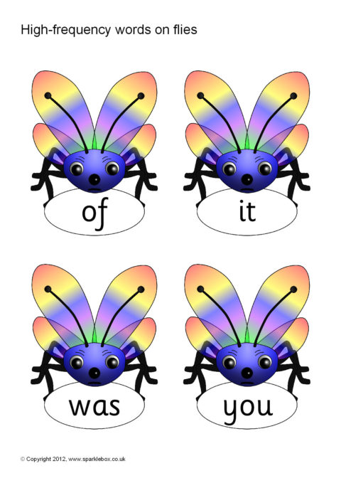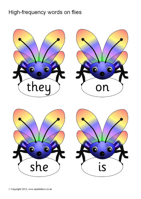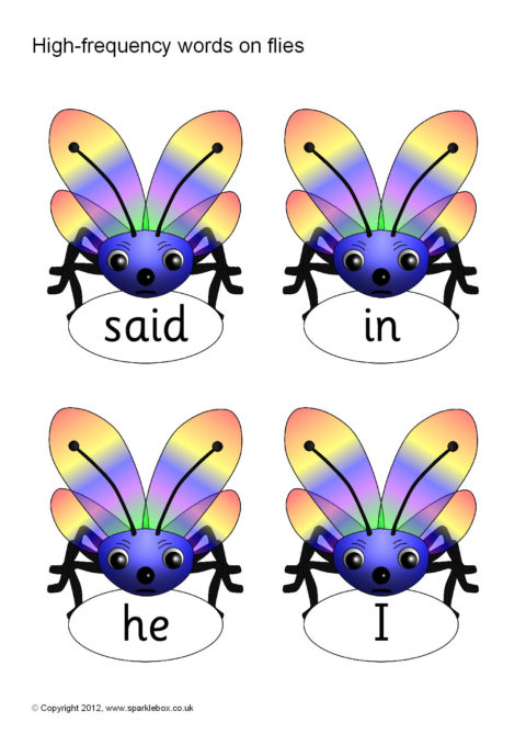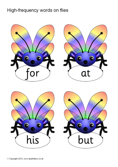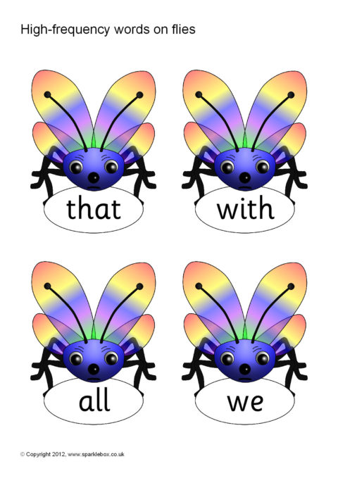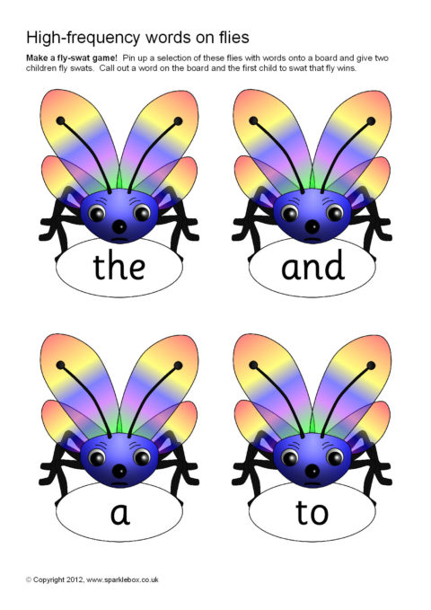 A set of 100 high-frequency words presented on cartoon flies. Ideal for creating a fly swat game where two children are given fly swats, the teacher calls out a word and the first child to swat the fly wins.