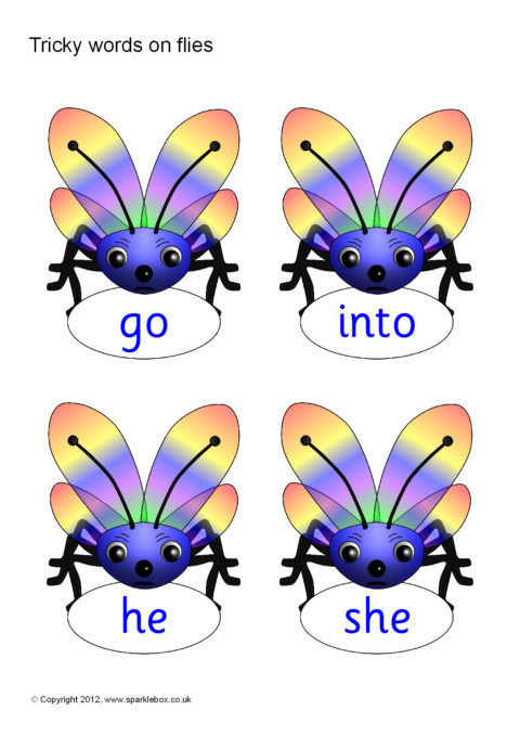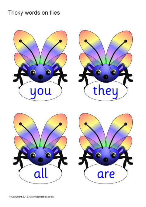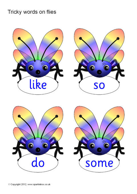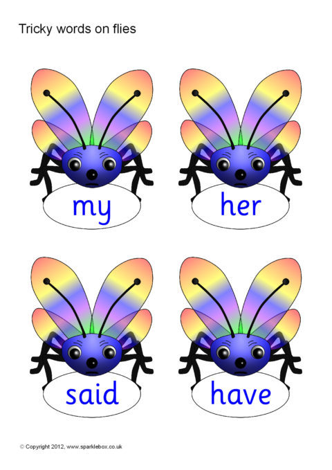 A set of tricky words presented on cartoon flies. Ideal for creating a fly swat game where two children are given fly swats, the teacher calls out a word and the first child to swat the fly wins.