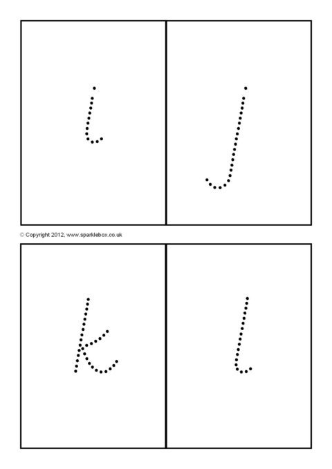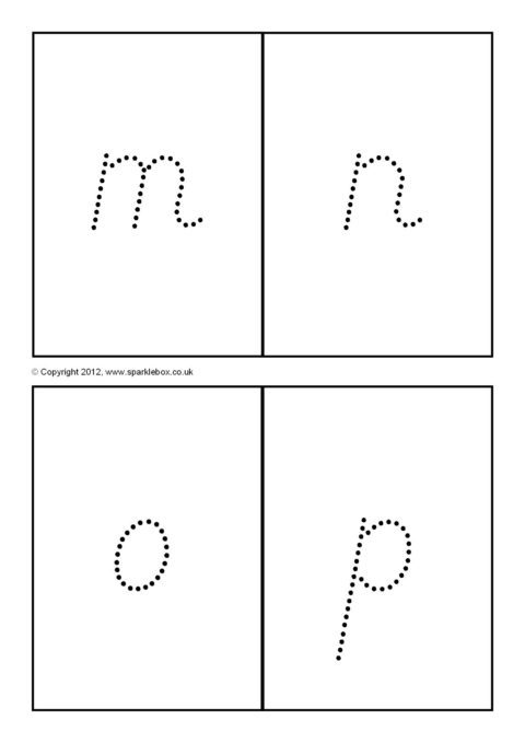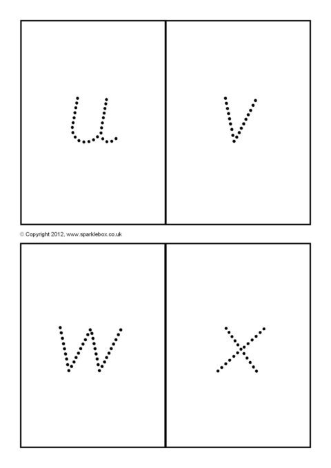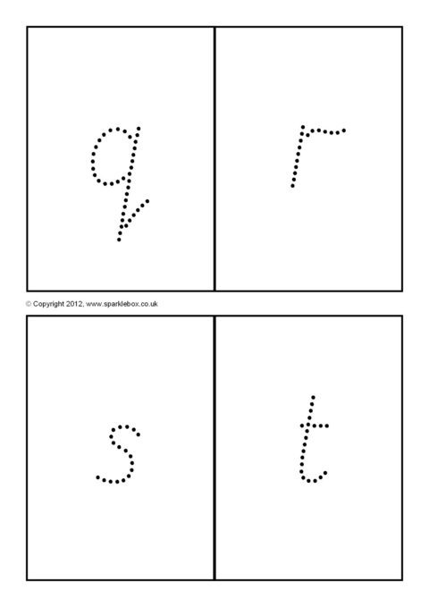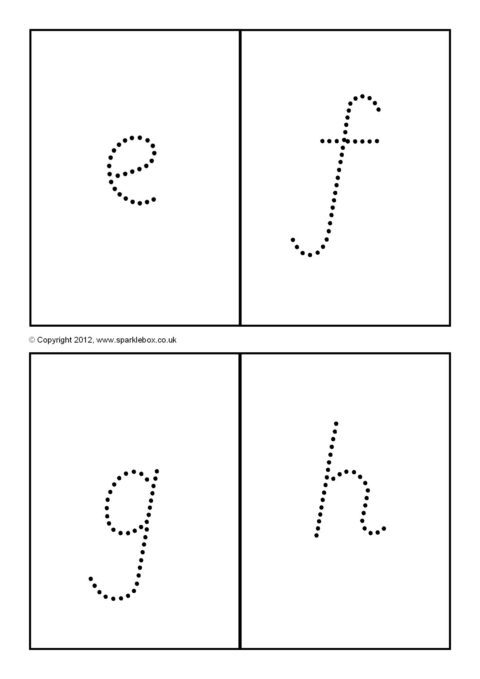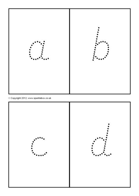The lowercase alphabet on printable cards, four to a page, in a ‘dotty’ format.