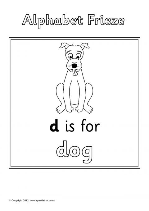 A print and colour alphabet frieze featuring pictures and words for each letter of the alphabet.