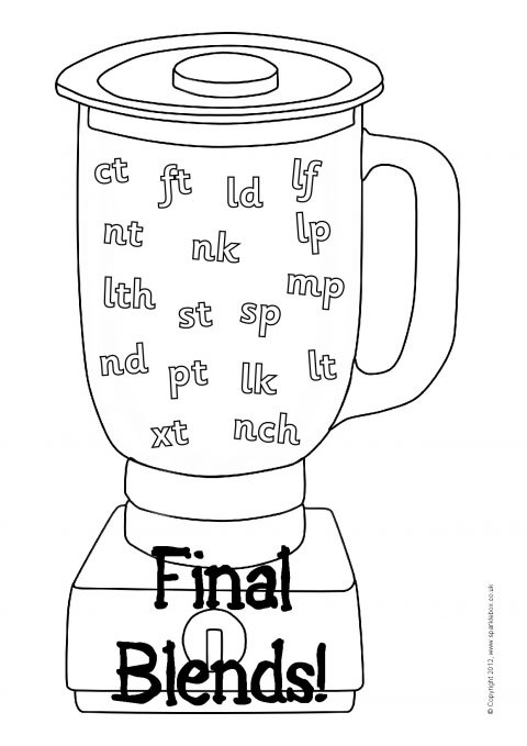 Printable visual aids showing final consonant blends in a blender. Includes black and white version ideal as an assessment sheet.