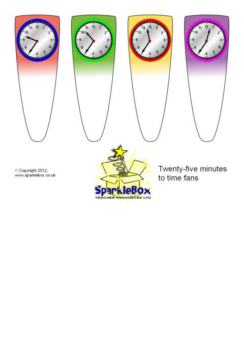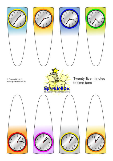 A printable set of fan segments featuring twenty-five minutes to analogue clock times. Print on card, laminate, and assemble into pupil fans with a split pin.
