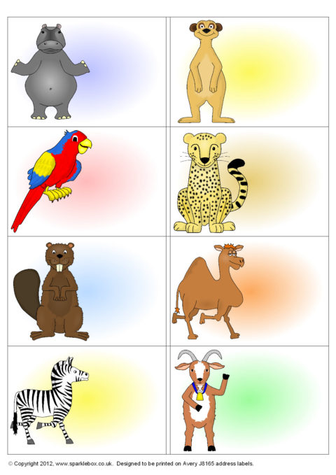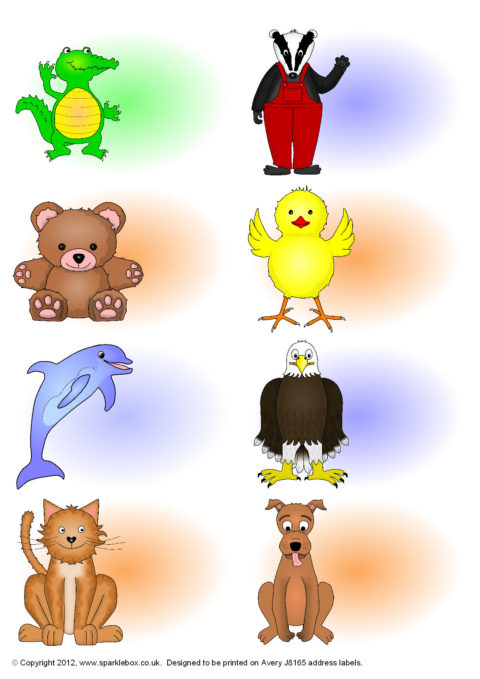 A set of editable sticker templates (8 stickers per A4 page) designed to be printed on Avery Labels J8165. Add your own text to stickers featuring a variety of fun cartoon animals.