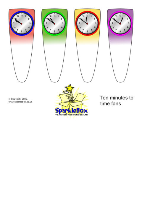A printable set of fan segments featuring ten minutes to analogue clock times. Print on card, laminate, and assemble into pupil fans with a split pin.