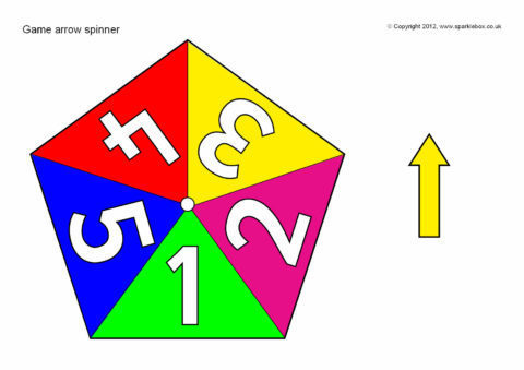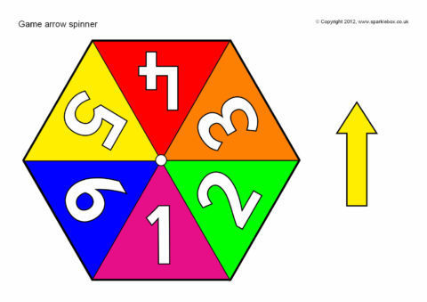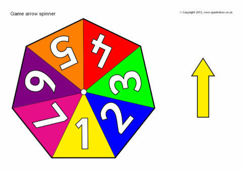 Printable arrow spinners for use in tabletop games. Includes spinners with numbers ranging from 1-3 to 1-10.