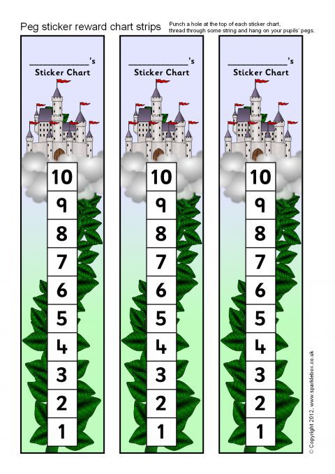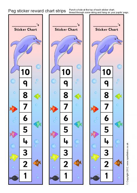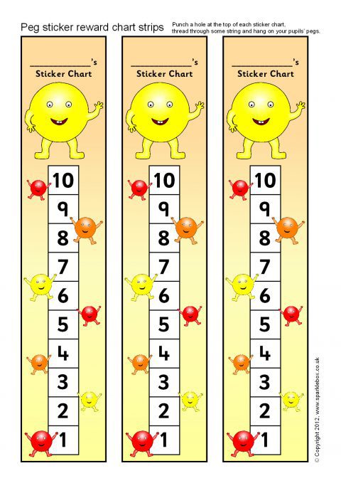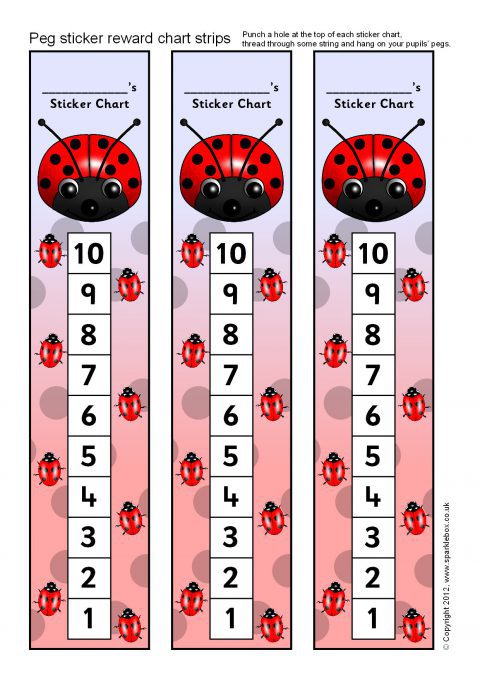 A set of printable sticker reward chart strips that you can print, laminate and hang from pupil’s pegs. Each includes a colourful fun design and space for 10 small stickers.