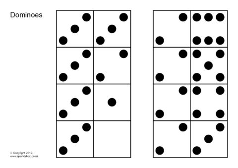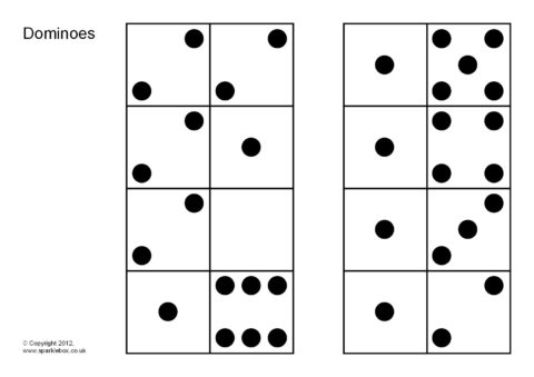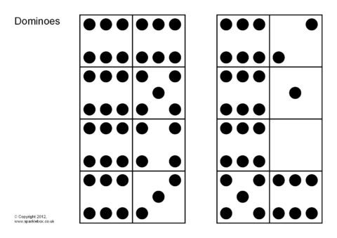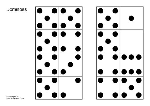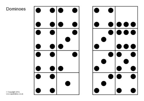 A set of small printable dominoes with dots in regular patterns 0-6.