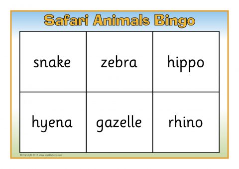 A set of printable bingo boards and picture cards featuring African safari animals.