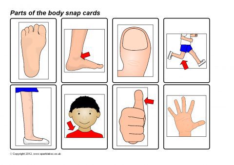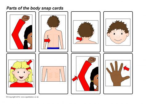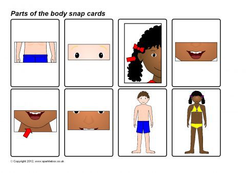 A set of printable picture cards featuring different parts of the body. Ideal for flash card games such as snap.
