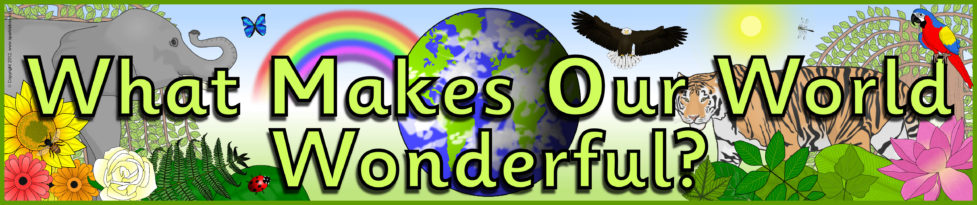 A colourful display banner with the title ‘What Makes Our World Wonderful?’ alongside images of nature.