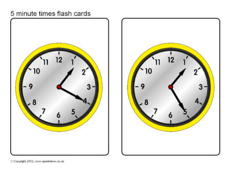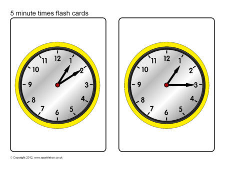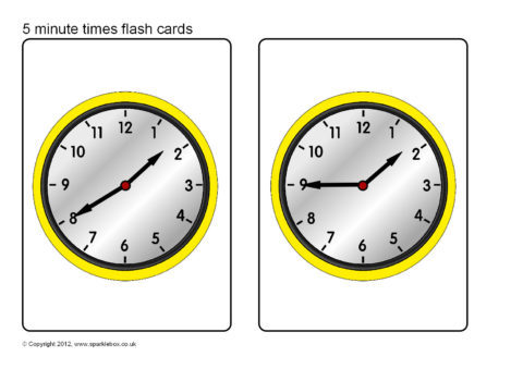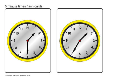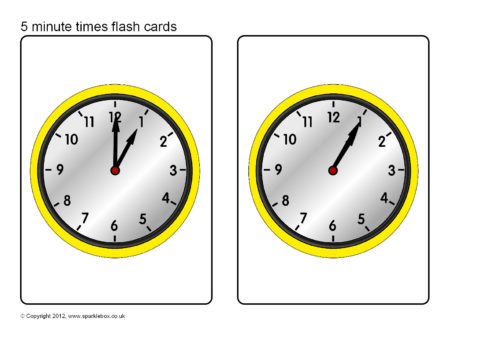 A set of flash cards featuring analogue times at 5 minute intervals.