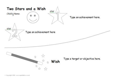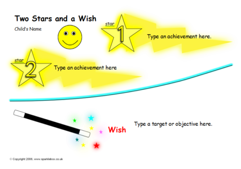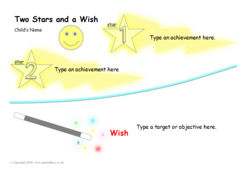 Editable ‘Two Stars and a Wish’ target sheets where you can type in pupils’ achievements and future goals.