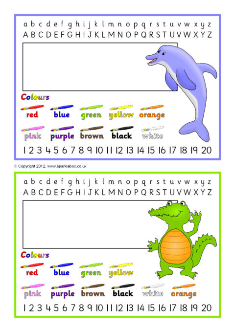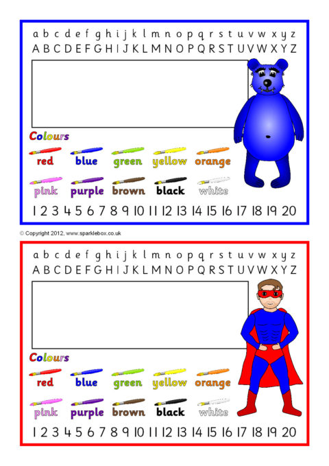 Printable placemats featuring the alphabet in lower and upper case, numbers from 1 to 20, colour words and space for the child’s name.
