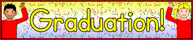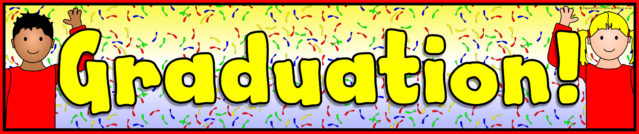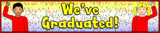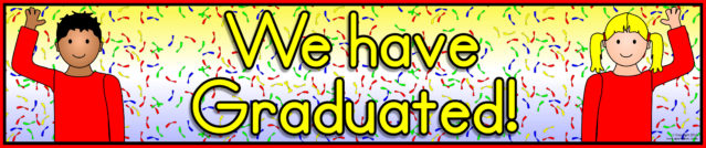 Brightly-coloured banners that print over 3 landscape pages with the titles, 'Graduation!' and 'We've Graduated!'.