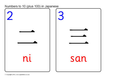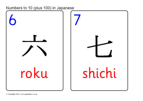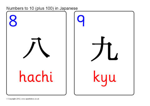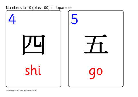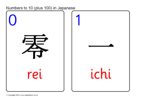 A set of flash cards featuring the numbers from 0 to 10 in Japanese with pronunciations. Includes 100 to enable teaching of all numbers up to 100.