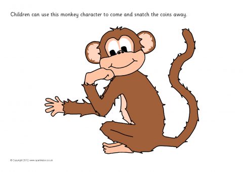 Printable desktop activity mats where children roll a dice and place coins in the pirate chest. They roll again for the monkey to sneak some away, then write the total or number sentence.