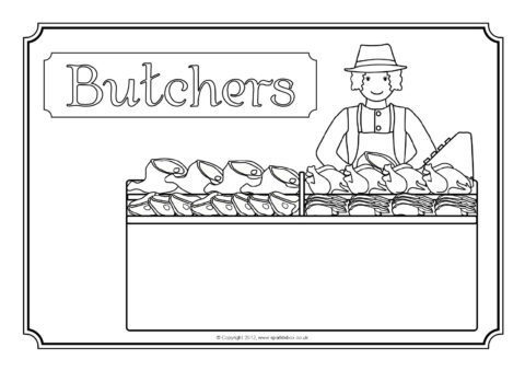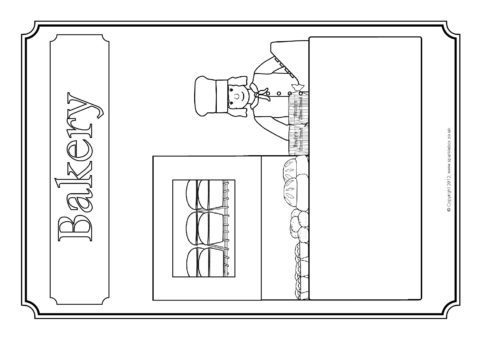 Simple colouring sheets featuring shops and other places where we buy different types of food.