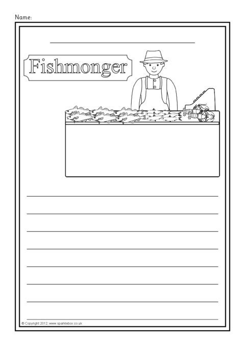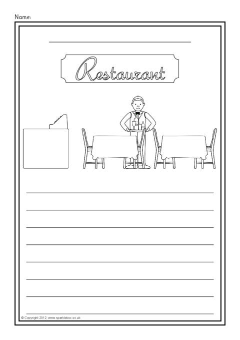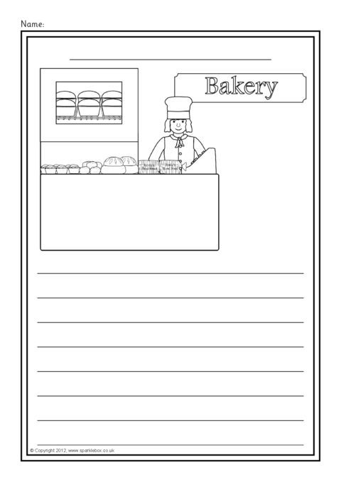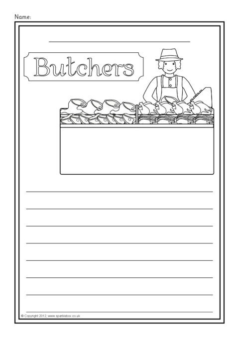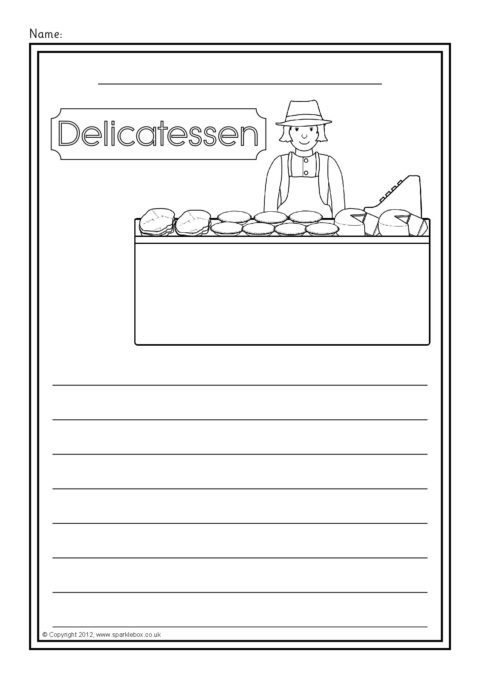 A set of simple printable sheets featuring images of shops and other places where we buy food for children to colour along with writing lines for topic-related writing.