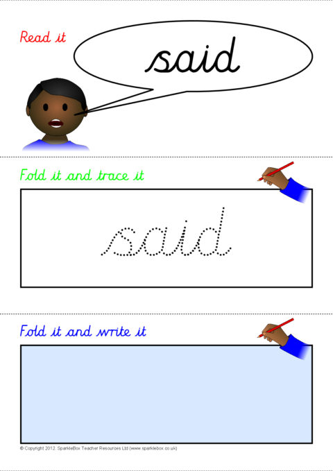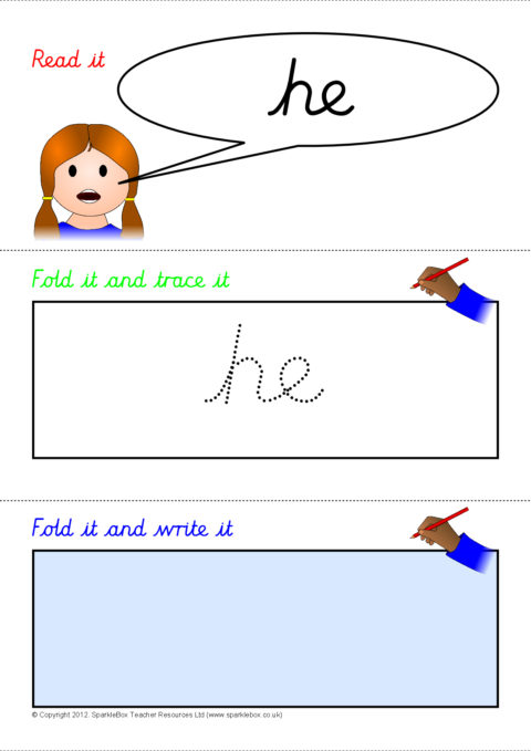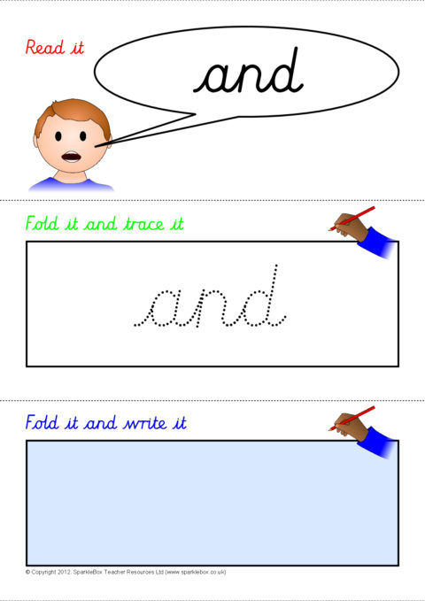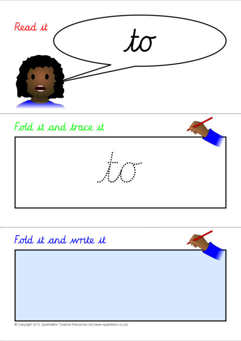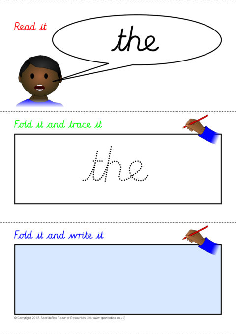 A set of fold-over A4 sheets featuring 100 high-frequency words in cursive script. The pupil reads the word then folds back, then traces the word and folds back and then writes the word from memory.
