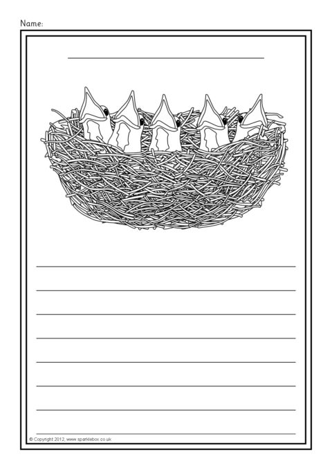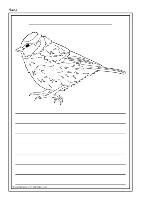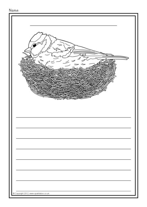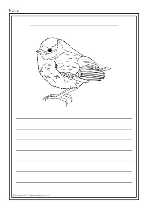 A set of simple printable sheets featuring images of blue tit growth for children to colour along with writing lines for topic-related writing.