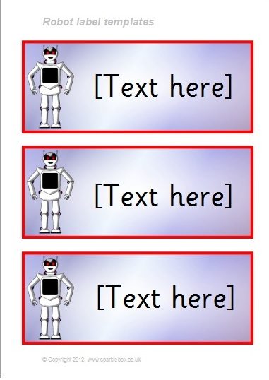 Add your own text to label backgrounds featuring robots using Microsoft Word. The labels can be resized in Word to suit your needs, and the text size and font can also be altered easily. Ideal for pupil name labels and classroom resource labels.