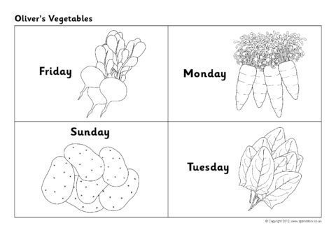 A set of simple black and white pictures (4-to-a-page) that can be cut out and sequenced. Alternatively, they can be used as stimulus for children’s own written retelling of the story. Includes versions with vegetable names and days of the week.