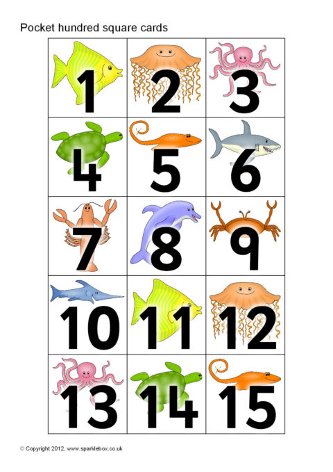 Printable square number cards featuring various kinds of cartoon sea creatures for your classroom pocket hundred grid.