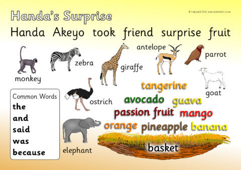 A printable A4-sized word mat with words and pictures linked to the story of ‘Handa’s Surprise’ by Eileen Brown.