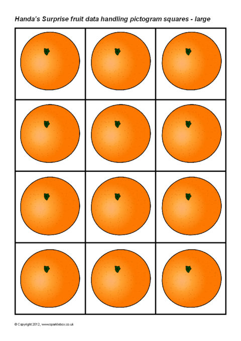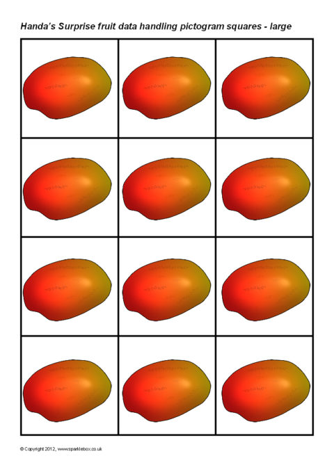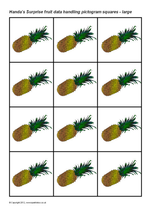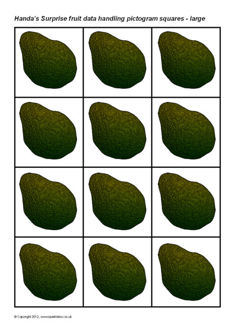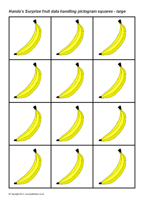 Printable squares featuring the fruit from the story of ‘Handa’s Surprise’. Ideal for use when creating a pictogram to showing the results of a class survey on their favourite fruit from the story.