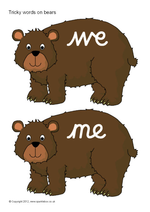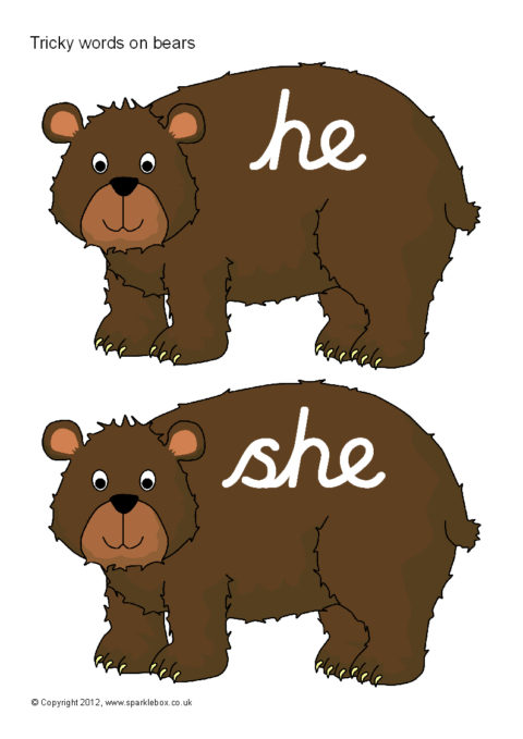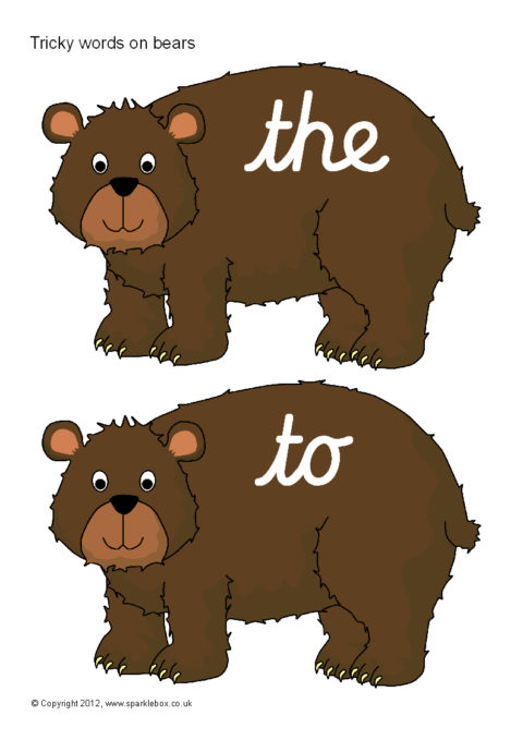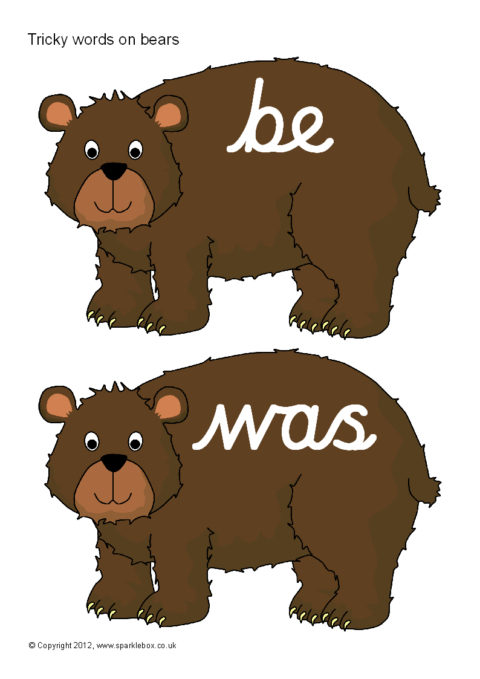 Tricky words in cursive script presented on a cartoon brown bear characters.