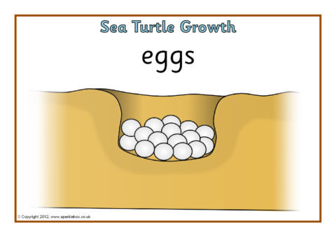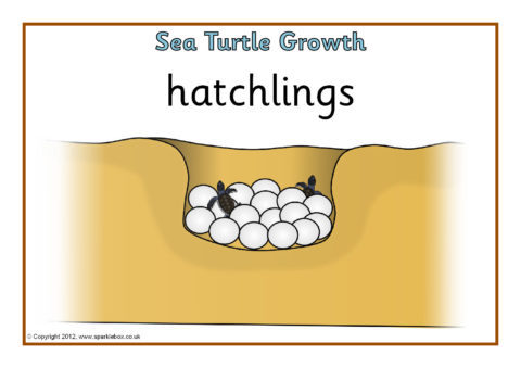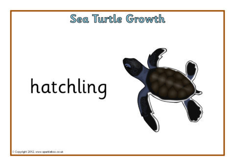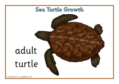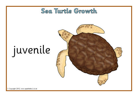 Simple A4-sized printable posters showing different stages in the growth of a sea turtle.