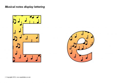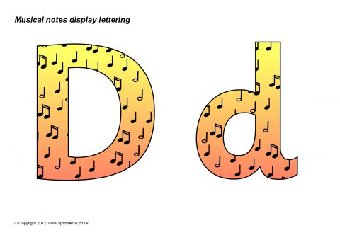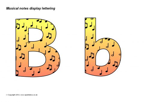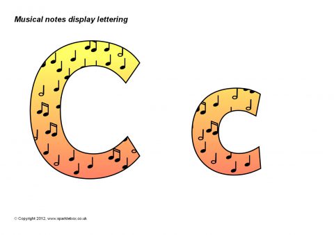 A PDF document with 26 alphabet letters (upper and lowercase) with a musical notes pattern. These are great for printing and cutting out for use on displays.