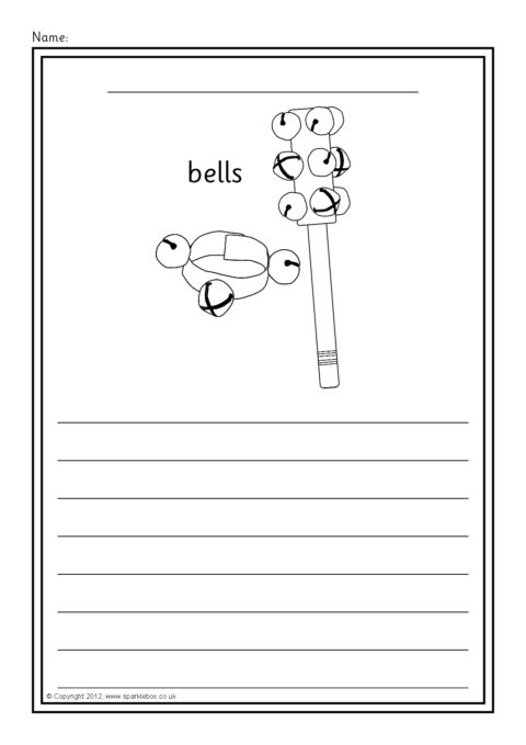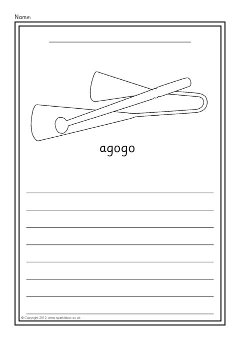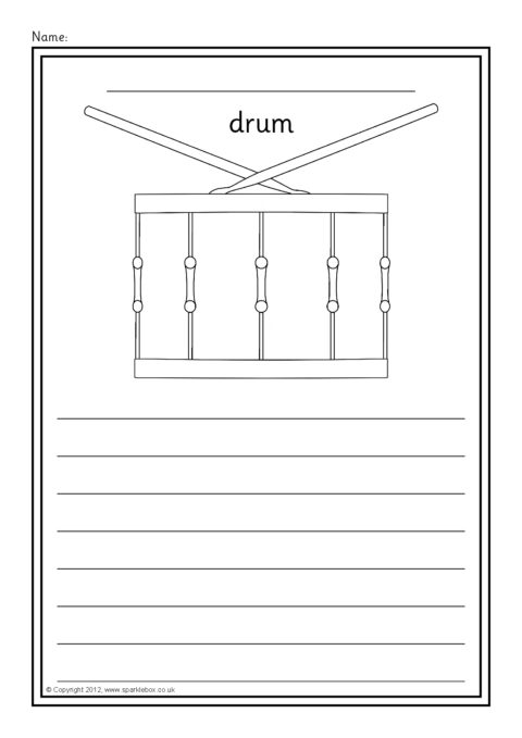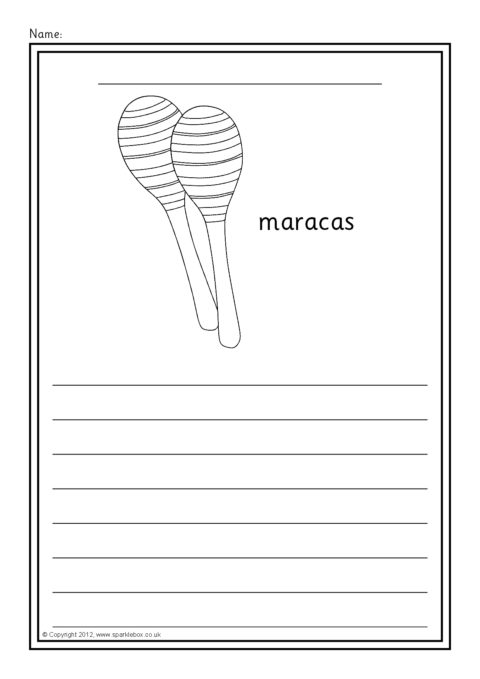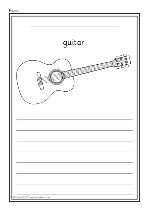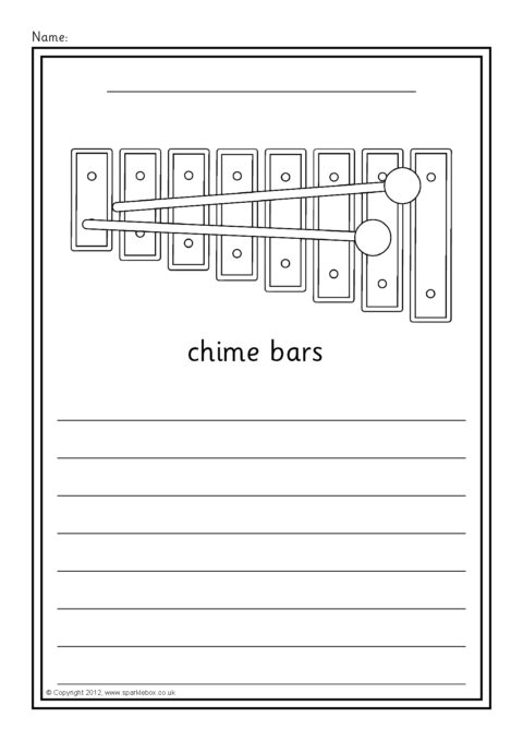 A set of simple printable sheets featuring pictures of various musical instruments for children to colour along with writing lines for related writing beneath.