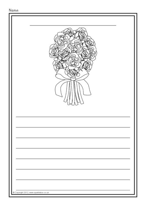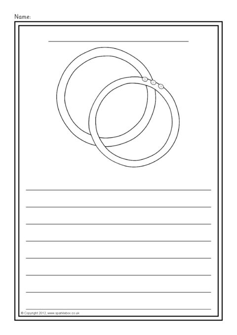 A set of simple printable sheets featuring pictures of things associated with traditional Christian weddings for children to colour along with writing lines for related writing beneath.