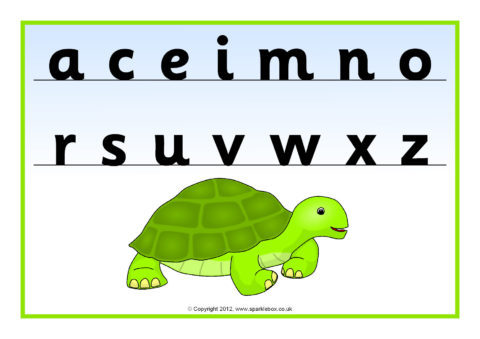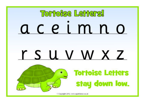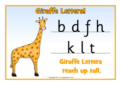 Fun posters to remind children of which letters reach up tall (like giraffes), stay low (like tortoises) and hang below the line (like monkey tails).