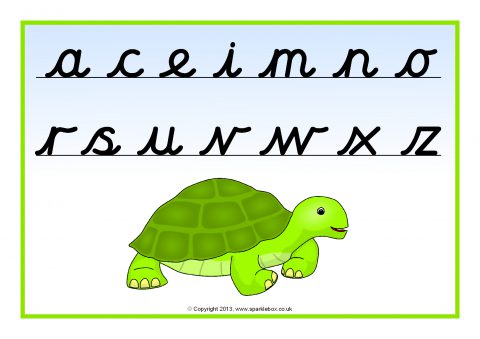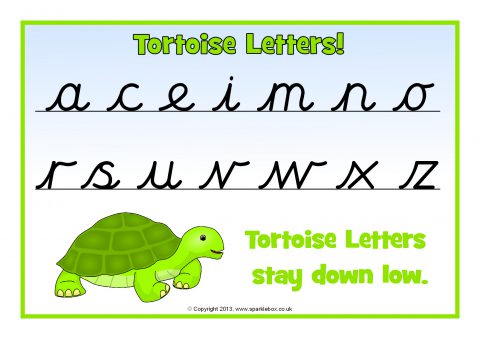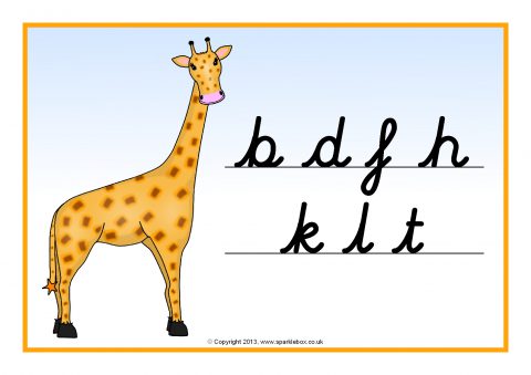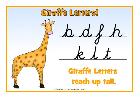 Fun posters to remind children of which letters reach up tall (like giraffes), stay low (like tortoises) and hang below the line (like monkey tails).