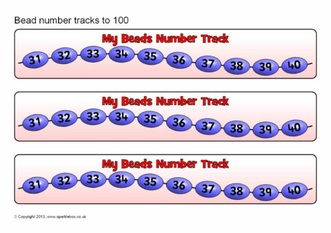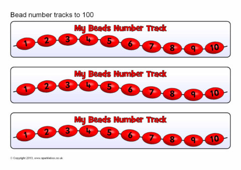 Printable number tracks featuring coloured threaded beads. Tracks are grouped in tens to 100.