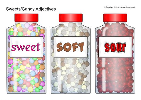A set of adjectives that can be used to describe sweets, presented on various colourful sweet jars and packets.