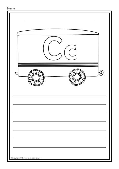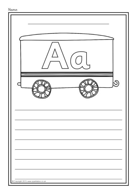 A set of simple printable sheets featuring train carriages with the alphabet letters in uppercase and lowercase and writing lines below. Great for word lists or letter formation practise.