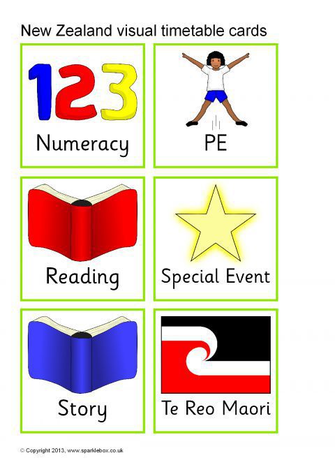 A colourful set of printable cards featuring the common activities and subjects covered in New Zealand schools. Includes a PDF with the timetable cards pre-arranged 6 to a page (A4) as well as resizable images.