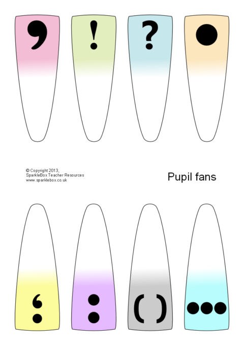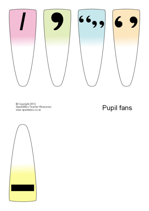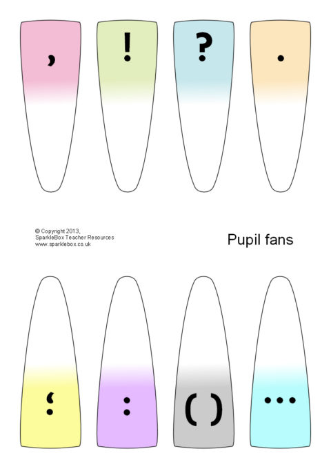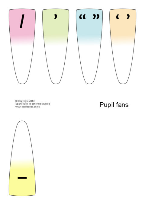 Printable fan segments featuring punctuation marks for use with your students. Assemble with a split-pin or paper fastener to make individual fans.