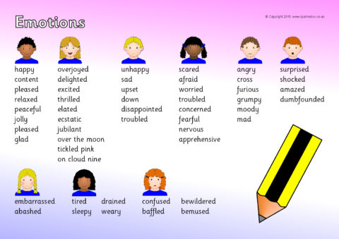 A printable desktop word mat with words to describe various emotions. Great as prompts to enhance children’s writing.