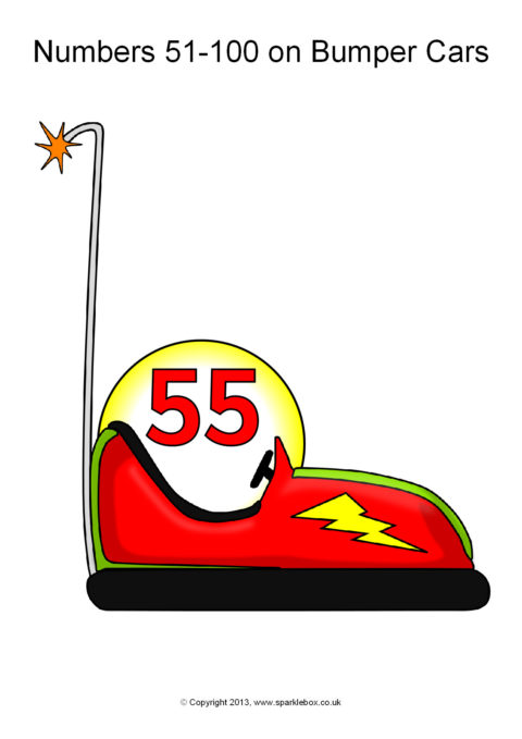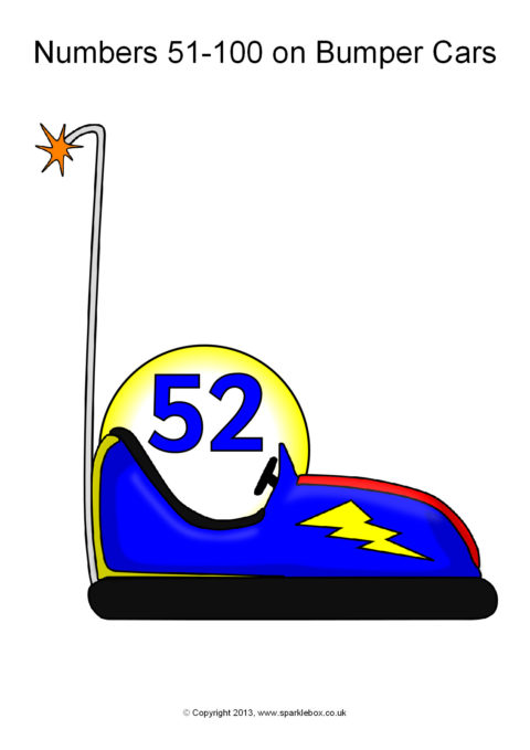 The numbers from 51-100 presented on fairground bumper cars. An extension of our Numbers 0-50 on bumper cars resource.
