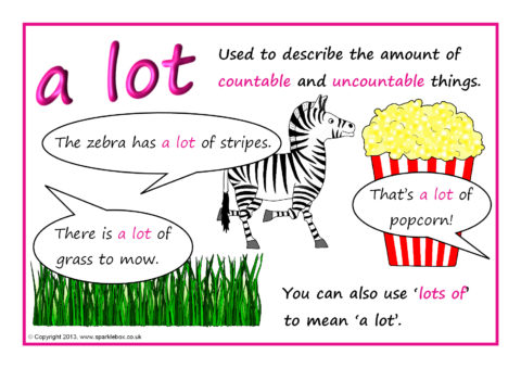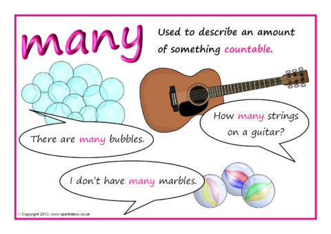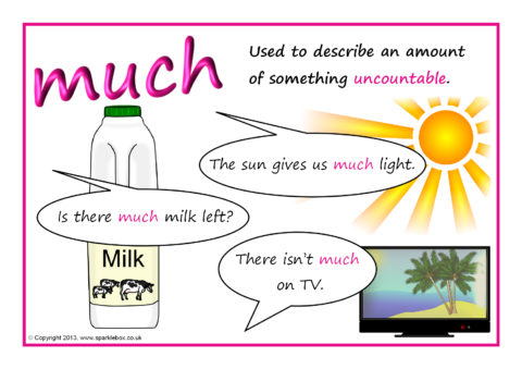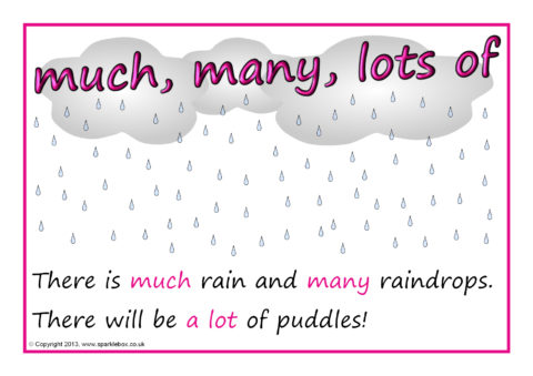 Printable posters that explain the difference in usage of ‘much’, ‘many’ and ‘lots of’ when describing quantity.