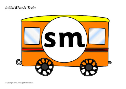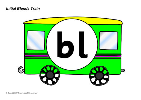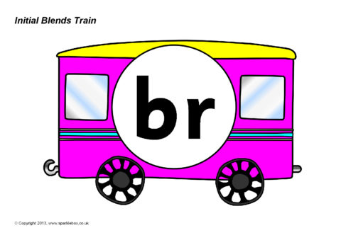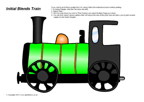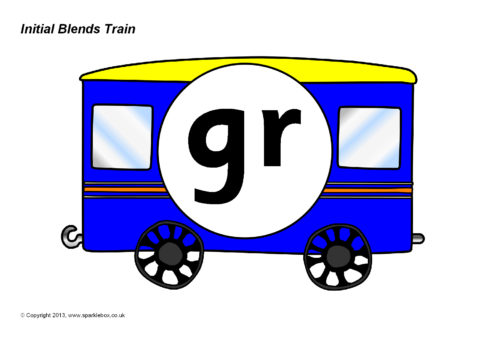 A printable train engine and carriages featuring the common initial consonant blends.