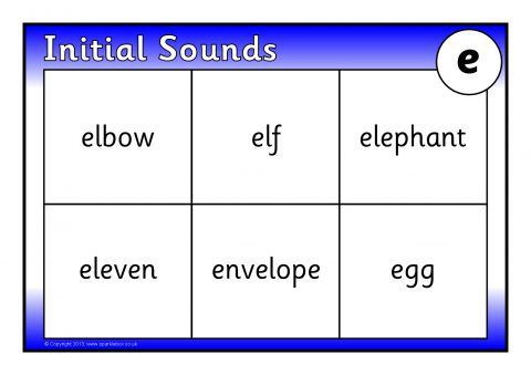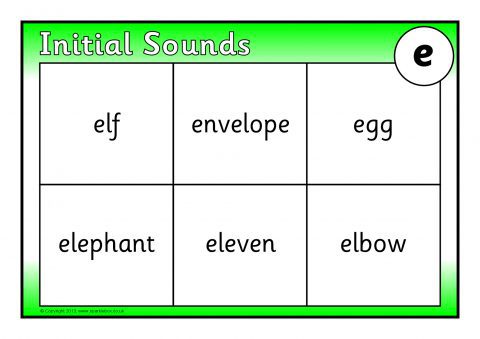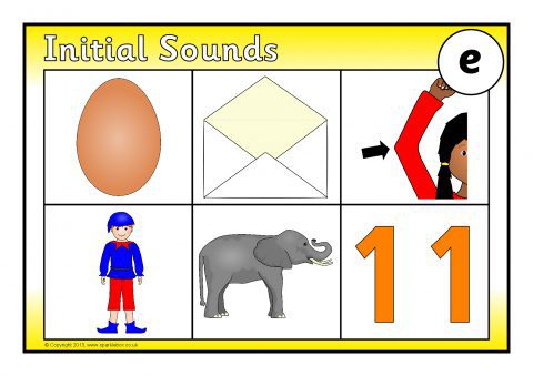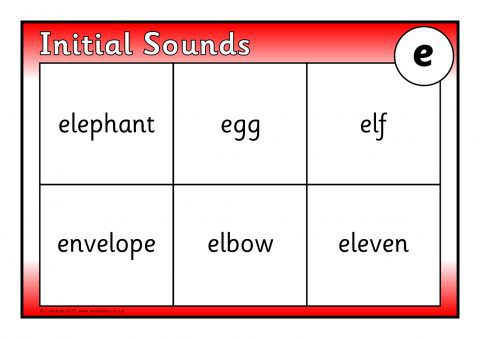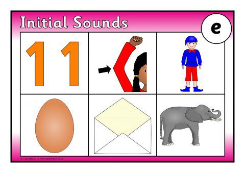 Printable bingo boards and picture cards where children match the pictures to the words featuring the initial sound ‘e’.