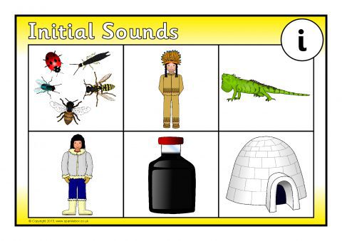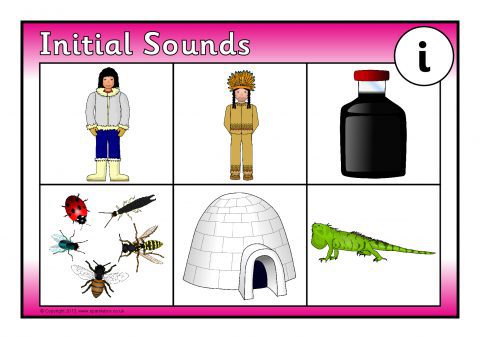 Printable bingo boards and picture cards where children match the pictures to the words featuring the initial sound ‘i’.