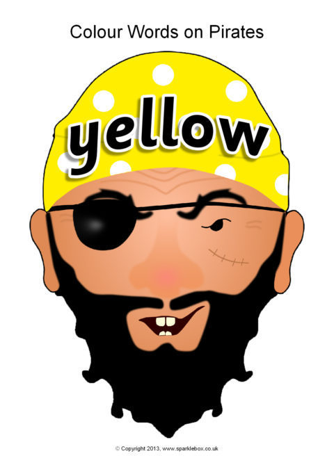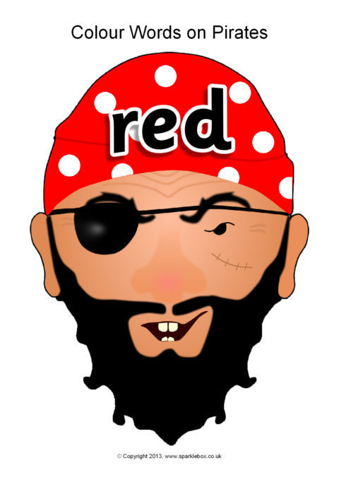 Colour words presented on pirate heads with coloured bandanas.