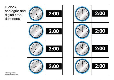 A printable domino set that features analogue and digital o’clock times. Players can match both analogue and digital times together. Great for helping children to recognise the same times written in both analogue and digital formats.
