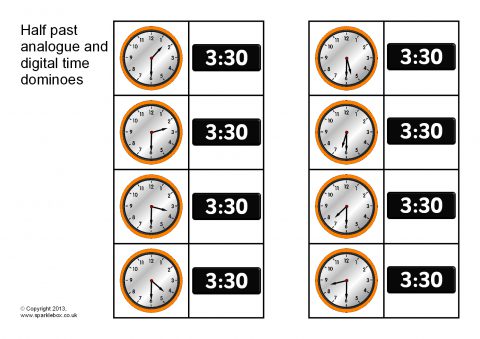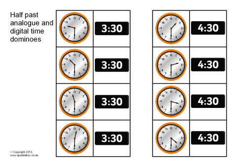 A printable domino set that features analogue and digital half past times. Players can match both analogue and digital times together. Great for helping children to recognise the same times written in both analogue and digital formats.